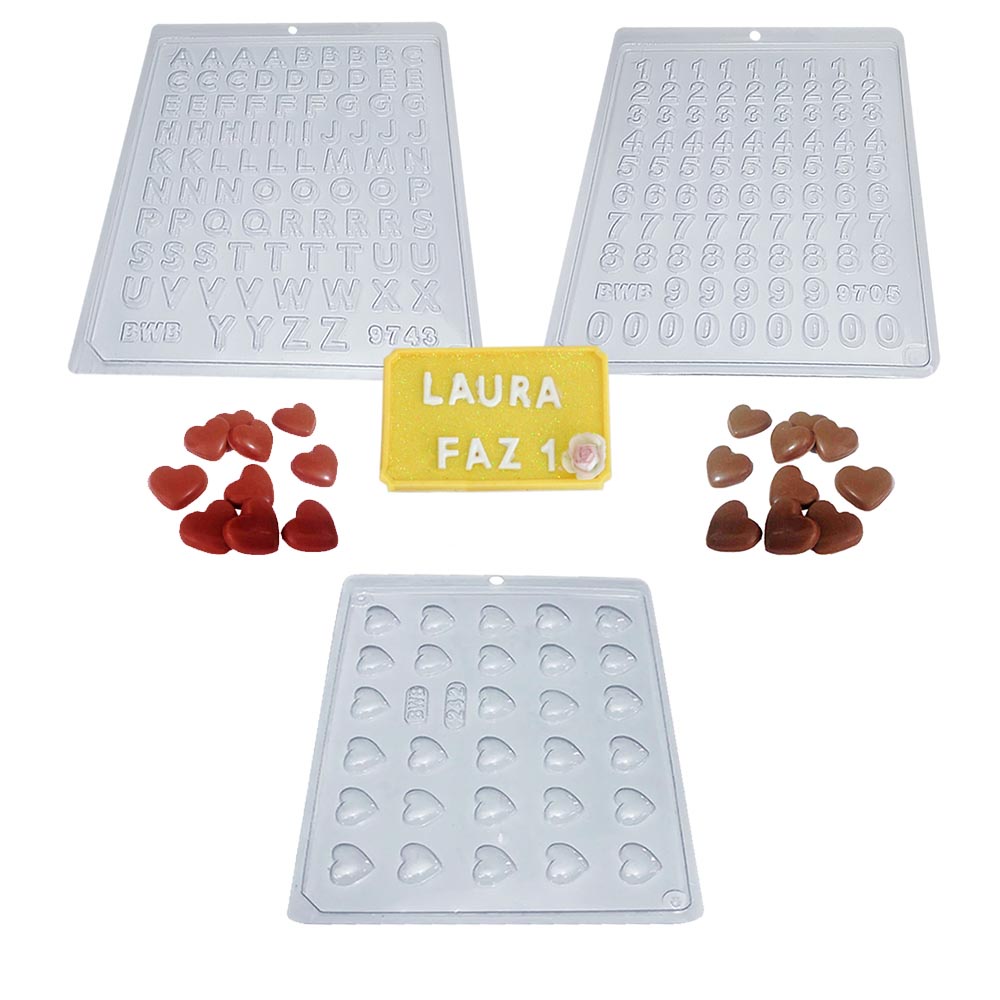 Kit 3 Formas de Acetato para Chocolate BWB Simples Sem Silicone Coração Mini + Mini Alfabeto + Mini Numero