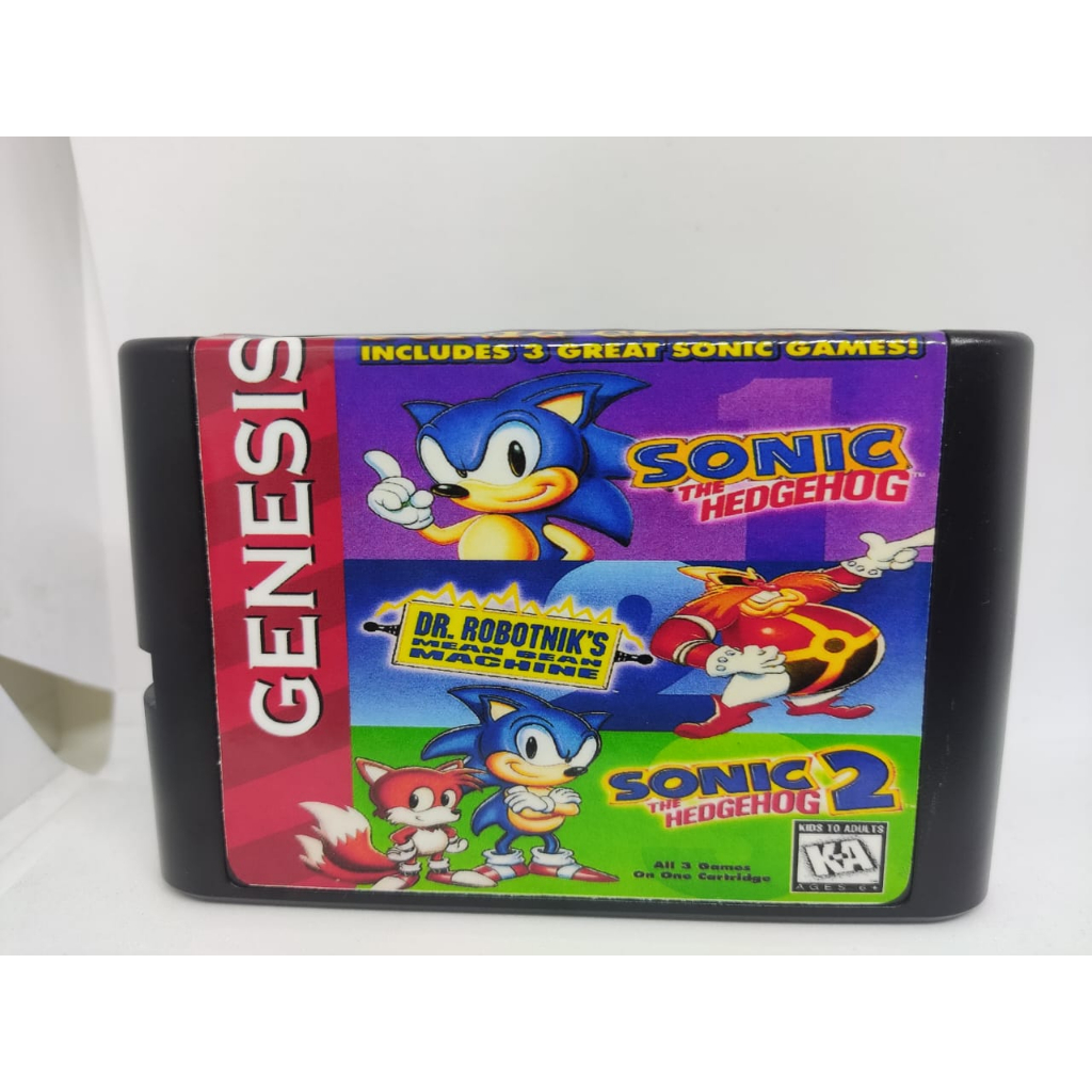 Fita 3 Jogos em 1 Sonic The Hedgehog 1 e 2 e Jogo Dr. Robotnik's Machine para Mega Drive Sega Genesis