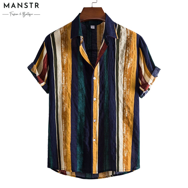 Camisa Masculina Listrada Havaí Com Manga Curta E Botão Lapela/Plus Size
