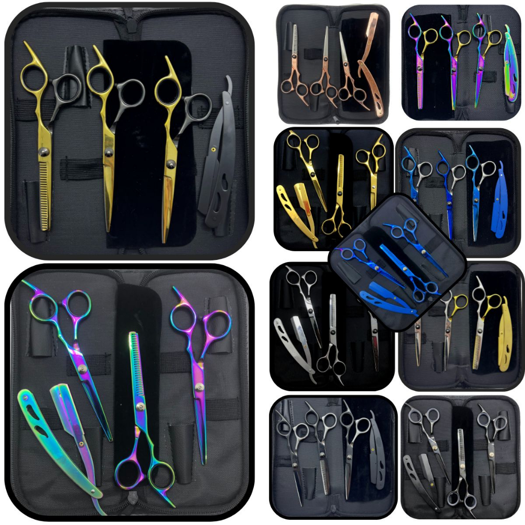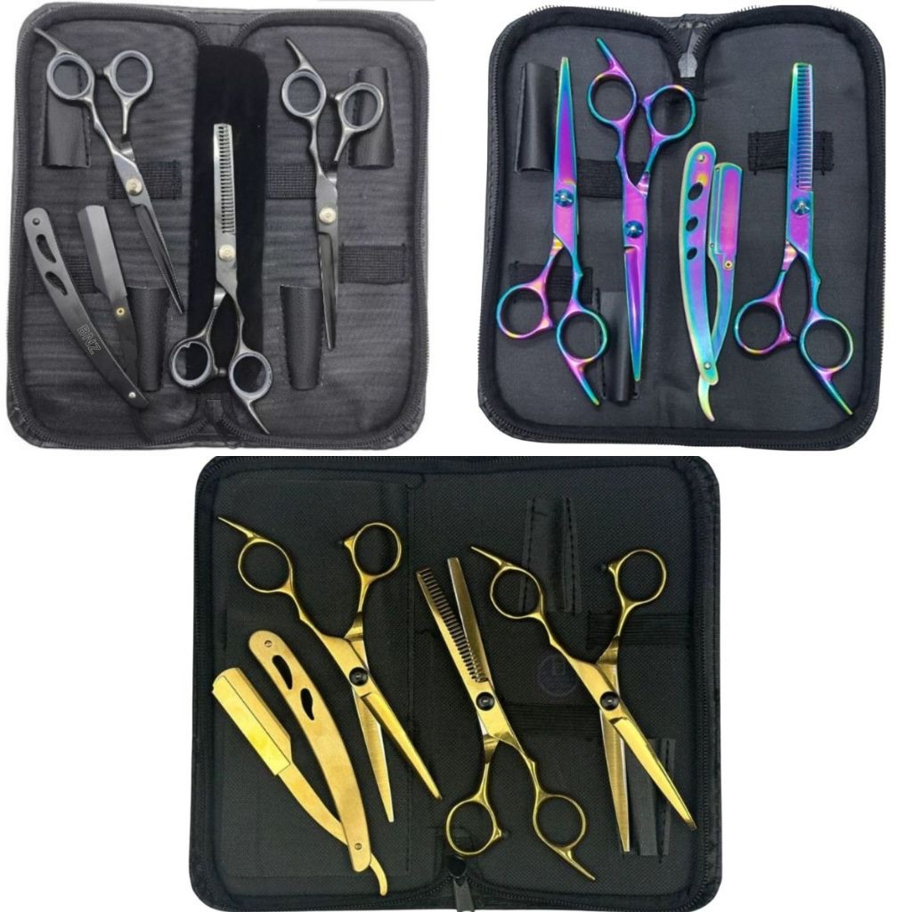 Kit 3 Tesouras Profissionais Barbeiro Fio Navalha Desbaste Preto Dourado Aurora Boreal Azul Prata