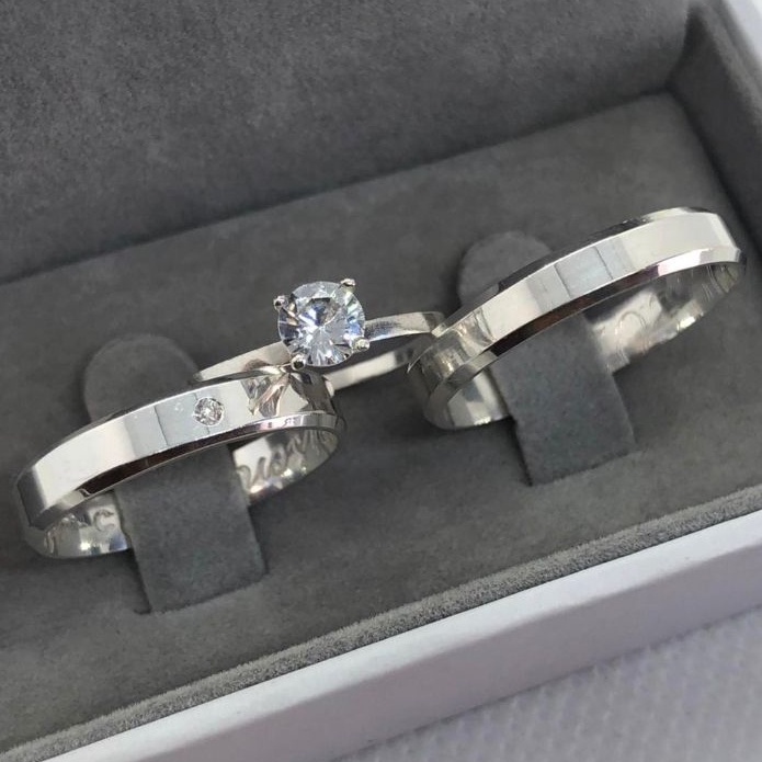 Par de aliança de namoro 3mm prata 950 Média a pronta entrega + anel solitario