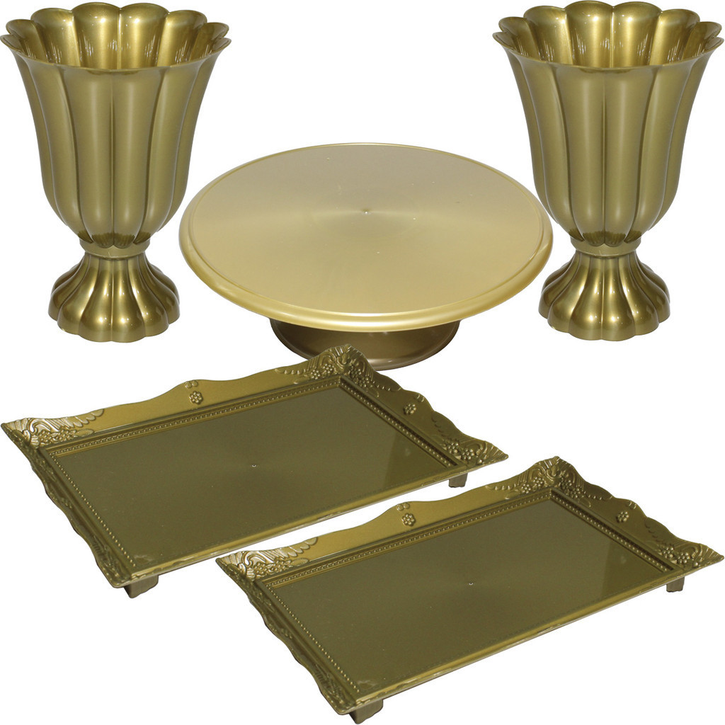 Kit Festa 5 Peças 2 Bandejas Doces 2 Vasos Slim 1 Boleira 20cm Diâmetro Dourado