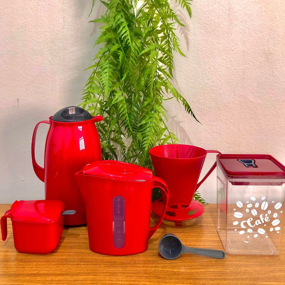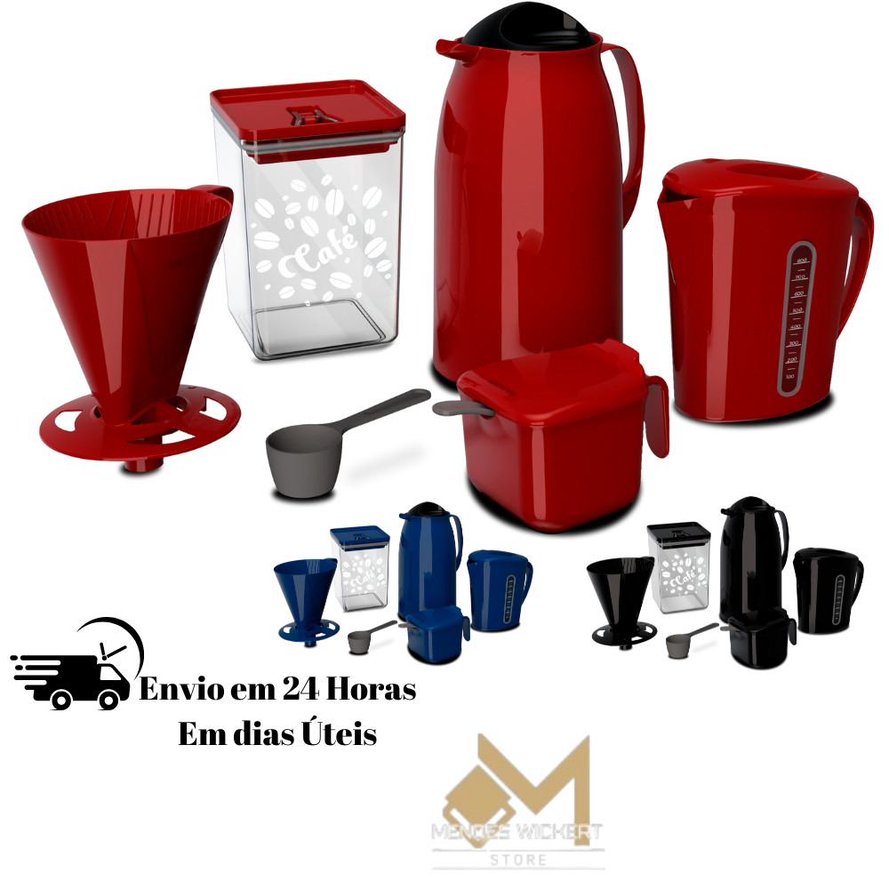 Kit Cantinho do Café Completo Super Prático 6 Peças Garrafa Térmica Leiteira Pote Hermético Suporte Filtro 103 Açucareiro Colher Trabalho Casa Escritório