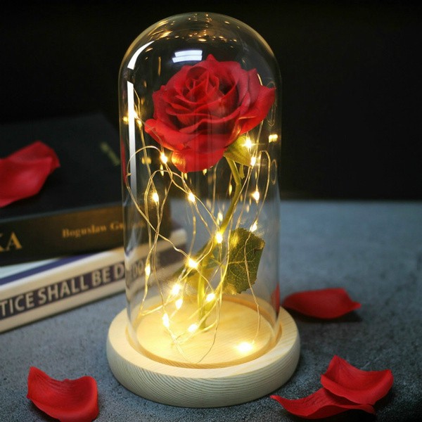 Luminária Cúpula 20 Cm A Bela E A Fera/O Pequeno Príncipe Com A Rosa Encantada Aveludada Com Cordão De Led