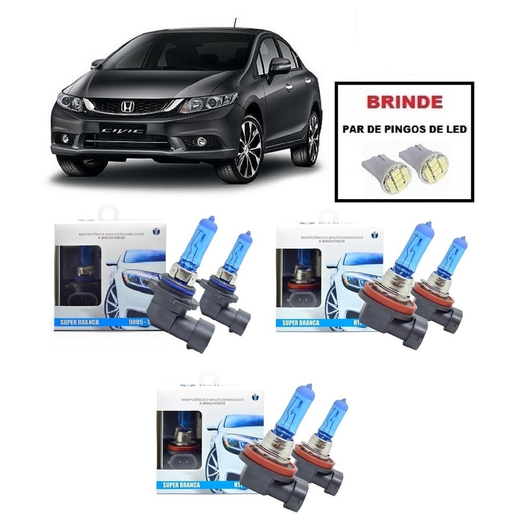 Kit 6 Lampadas Super Brancas para Farol Alto / Baixo e Milha Modelo HB3 H11 e H11 com 8500 Kelvins para Honda New Civic ano 2015 2016 2017 2018 2019 2020