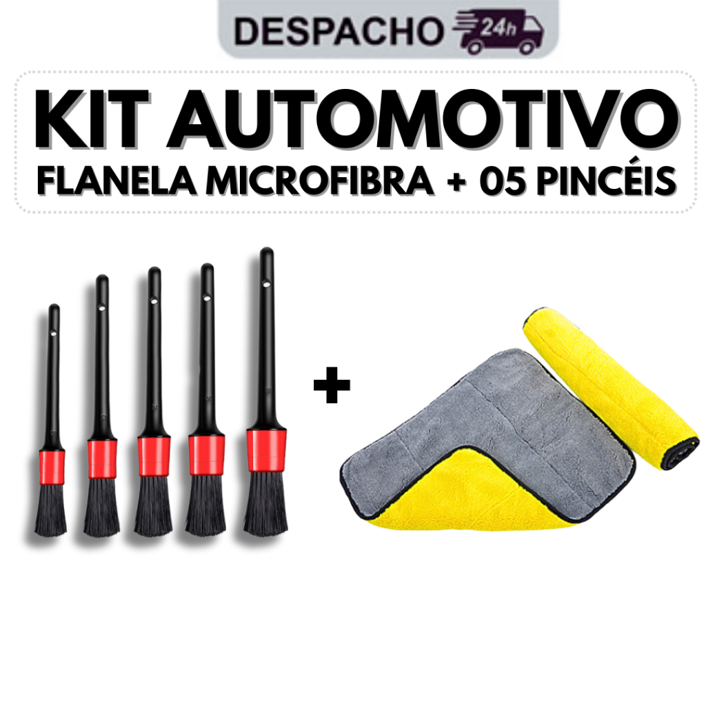 Kit Automotivo Lavagem Flanela de Microfibra 30x40cm + 05 Pincel Detalhamento