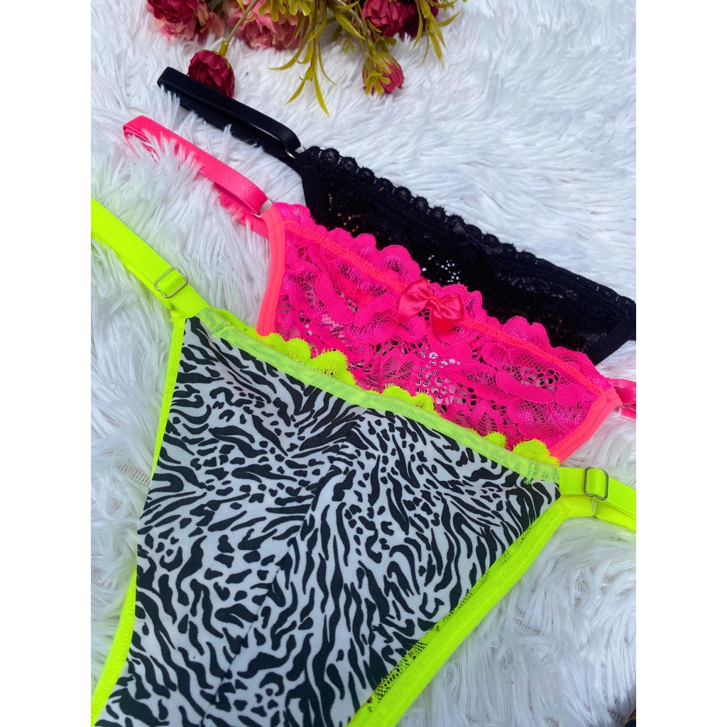 Kit c/ 3 Tanga Fio Duplo Plus Size Microfibra Estampada Rendada com Regulagem