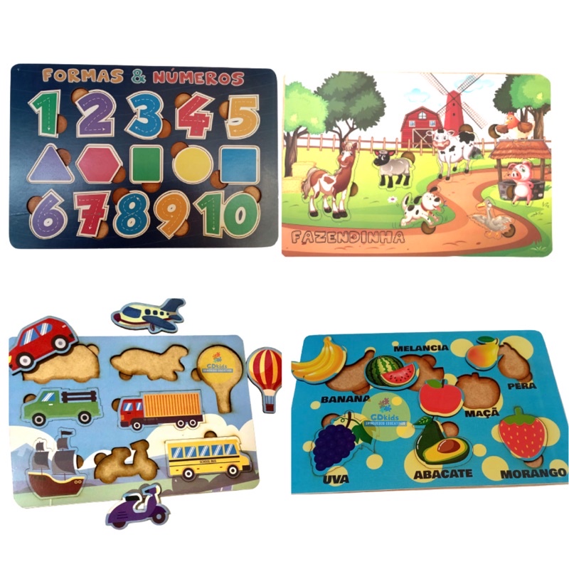 Kit 4 Brinquedos Educativos e Pedagógicos de Encaixe em MDF Quebra Cabeça Educativo Frutinha Transporte Fazendinha Formas Geométricas Números Quebra Cabeça Infantil