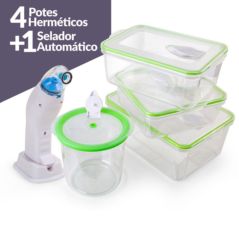 Jogo de 4 Potes Herméticos Vacuum e Selador a Vácuo Automático Moda do Chef