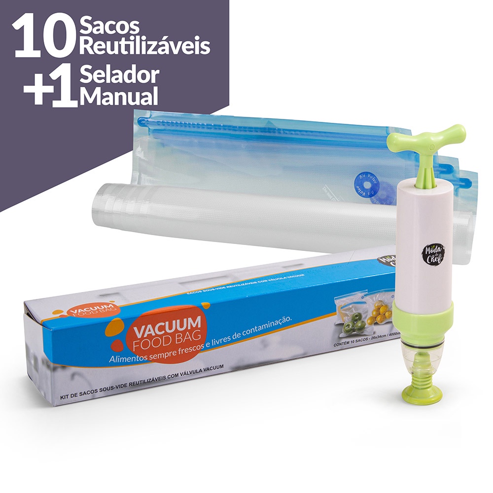 Jogo de 10 Sacos Reutilizáveis Vacuum 4 L e Selador a Vácuo Manual Moda do Chef
