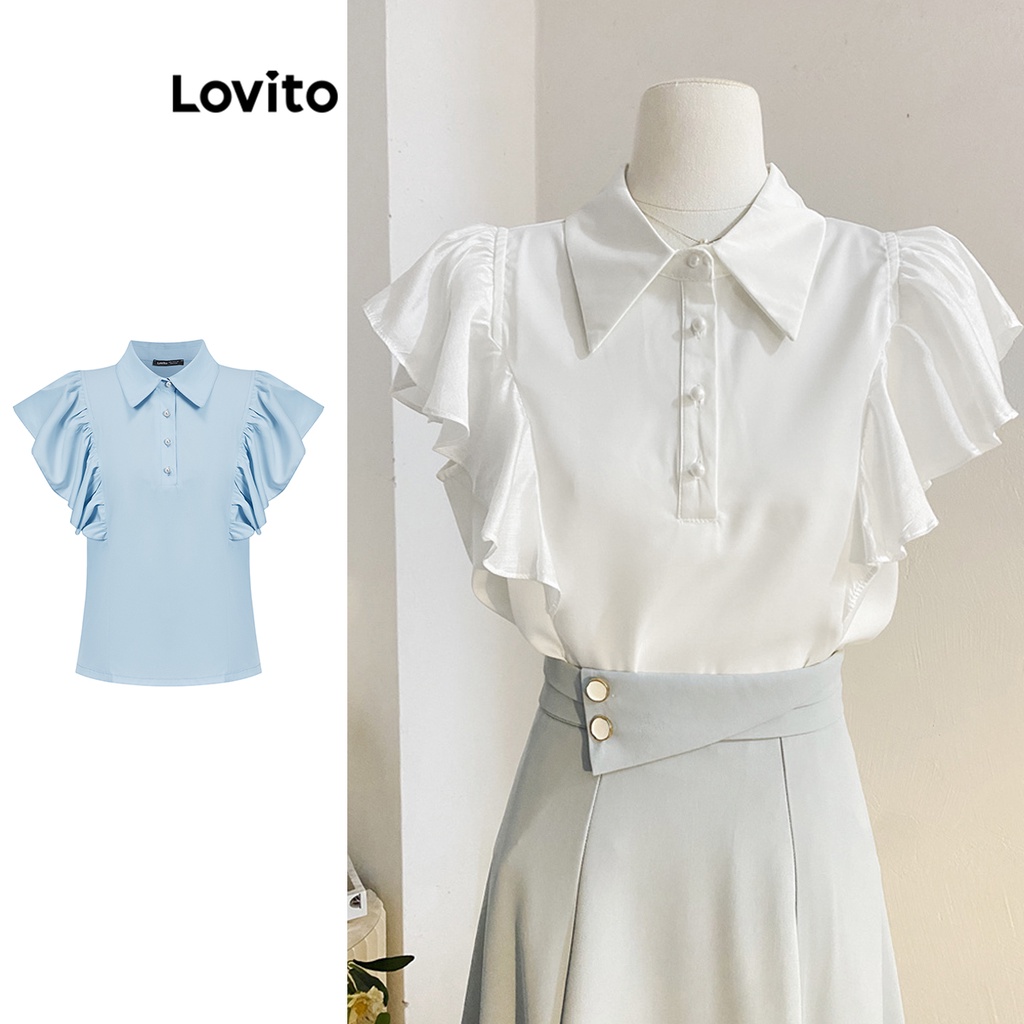 Lovito Blusa Elegante com Botões Frontais e Babado para Mulheres L74ED116 (Branco/Azul)