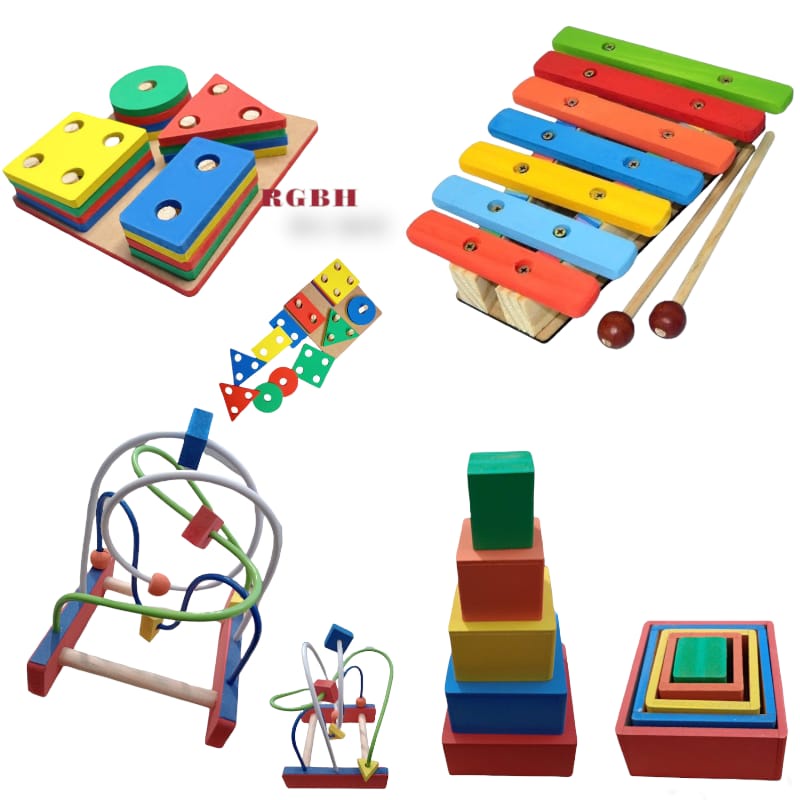 Kit Brinquedo Educativo Madeira Xilofone + Prancha Seleção + Aramado M + Cubo De Encaixe Vol 1