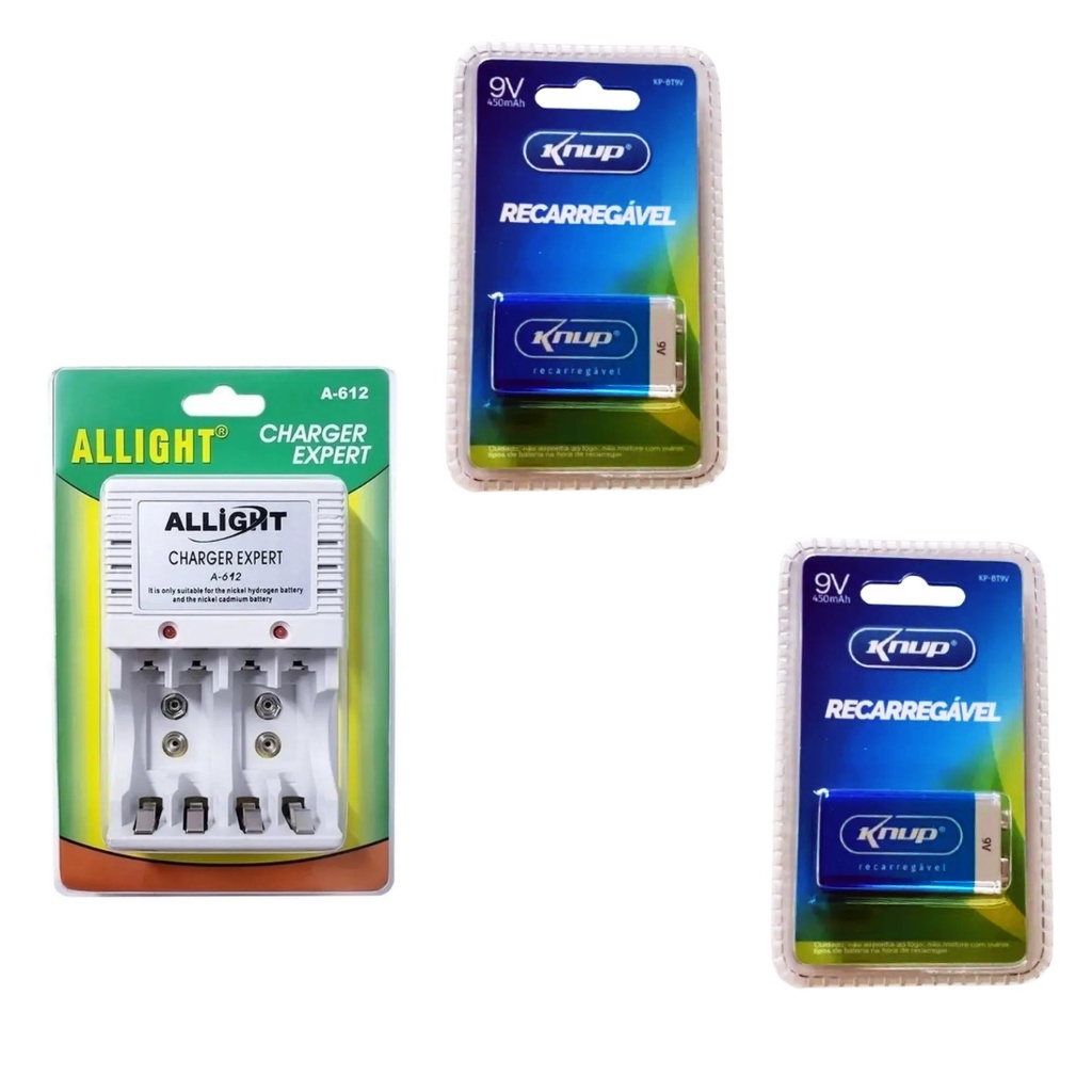 Kit 2 Baterias Recarregável 9v + Carregador Bateria Pilha Aa/aaa/9v