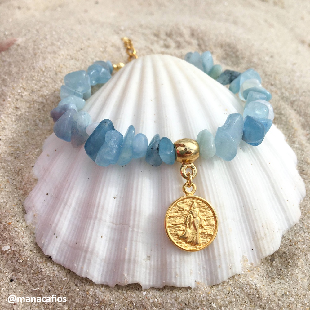 Pulseira de Iemanjá Umbanda Candomblé Cascalho Água Marinha Aquamarine Pedra Natural Yemanjá Yemanja Iemanja