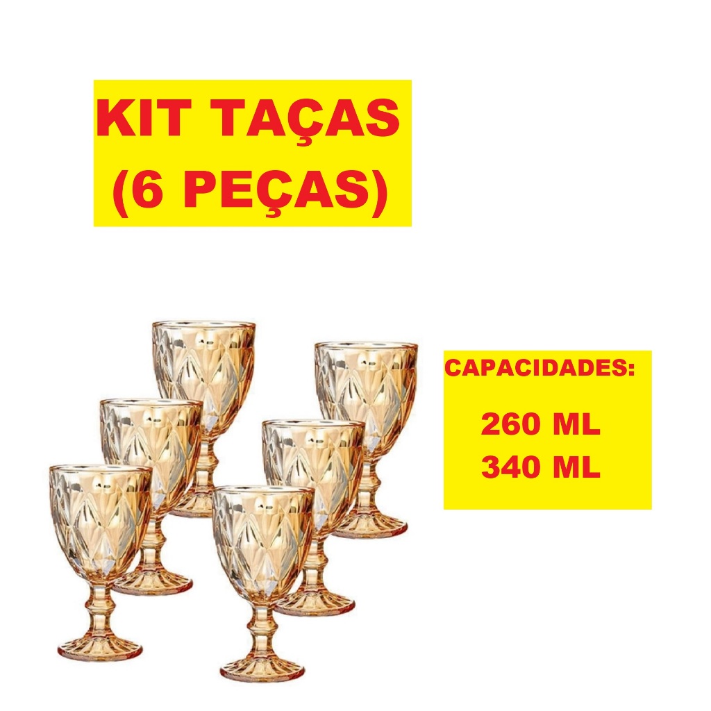 KIT 6 Peças De Taças 340ML 315ML 260ML E 50ML De Vidro Diamond Ambar E Fume Vinho Água Drinks