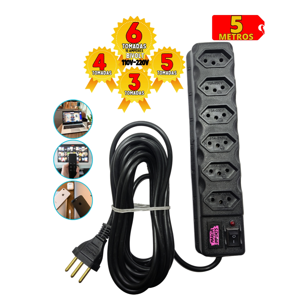 Filtro de Linha Régua Elétrica 6 Tomadas Cabo 3 Metros e 5 Metros bivolt Com Proteção Fusível Chave E Led