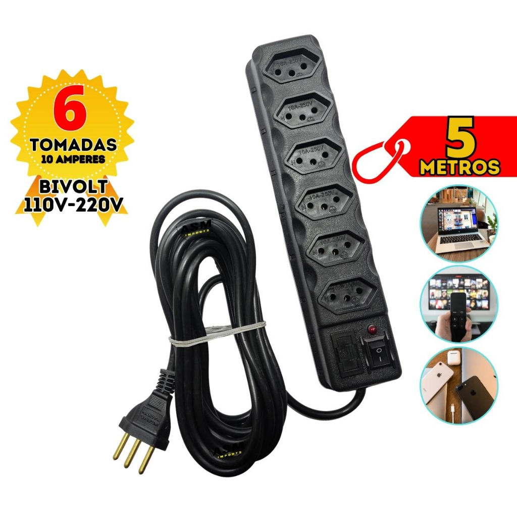 Regua Eletrica 6 Tomadas 5 Metros Filtro De Linha Bivolt 110 220 10A