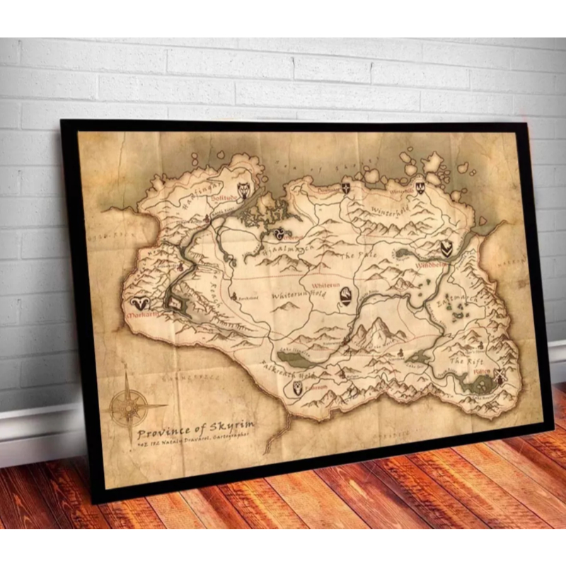 Quadro Decorativo game geek Mapa Elder Scrolls Skyrim com Moldura