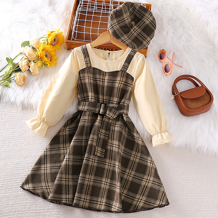 Siyyyis Khaki Cor Boina De Manga Comprida Patchwork Vestido Para Crianças Meninas Roupas Casuais Coreanas Com Estilo 4-7 Anos Bebês