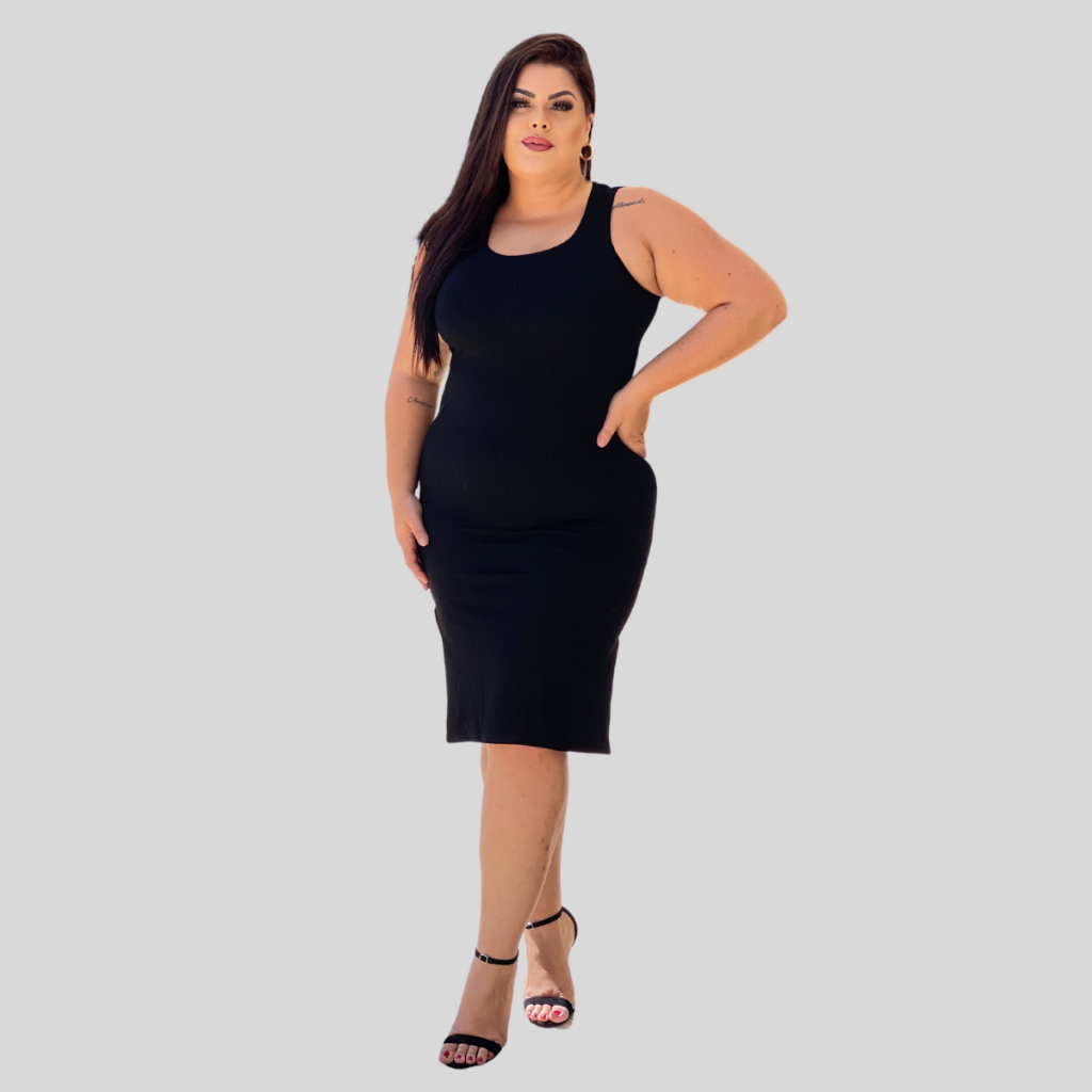 Vestido Plus Size Regata Midi Canelado Tubinho com Fenda Lateral