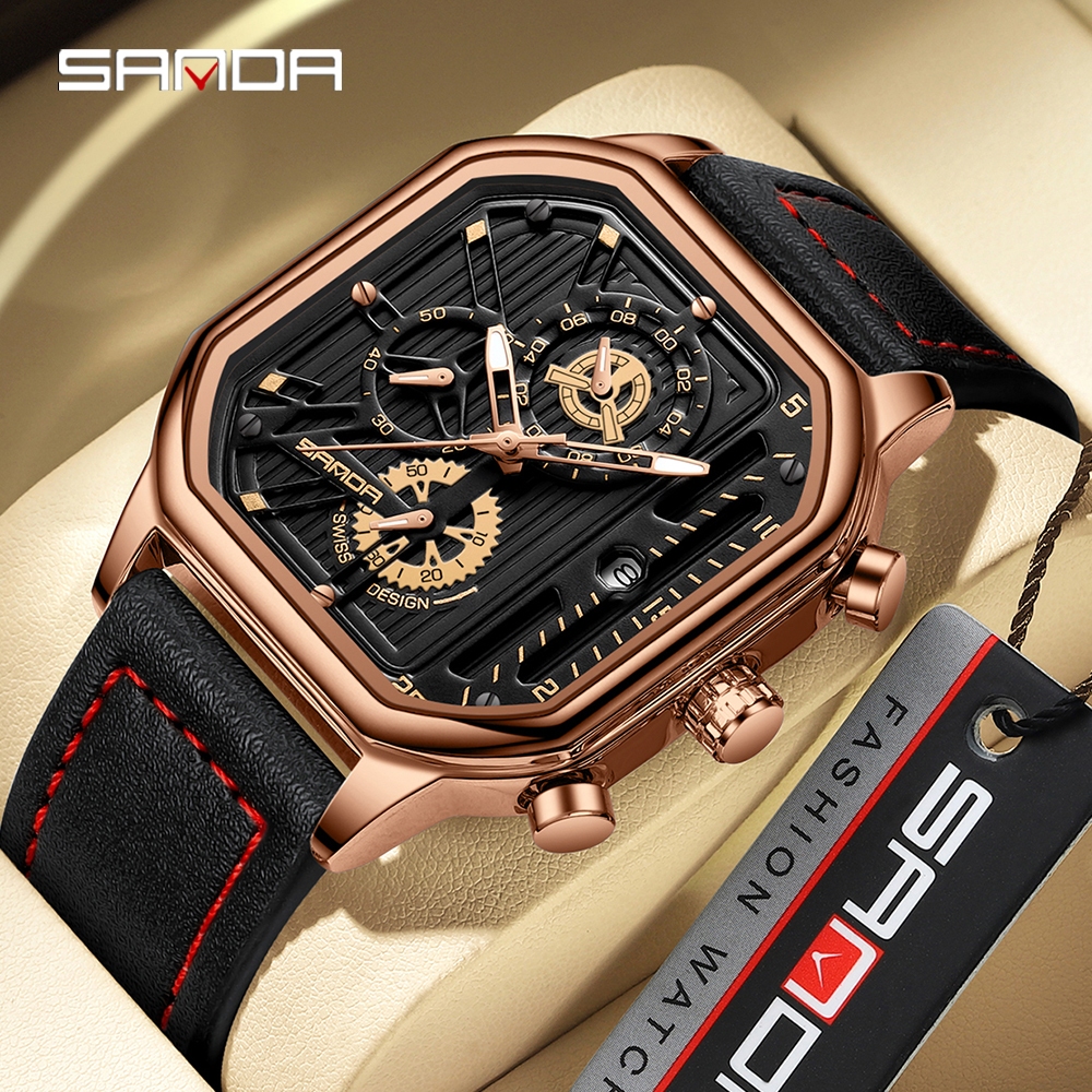 SANDA Fashion Square Dial Leather Steel Mens Relógios Esportivos De Luxo Relógio Cronógrafo De Quartzo De Pulso