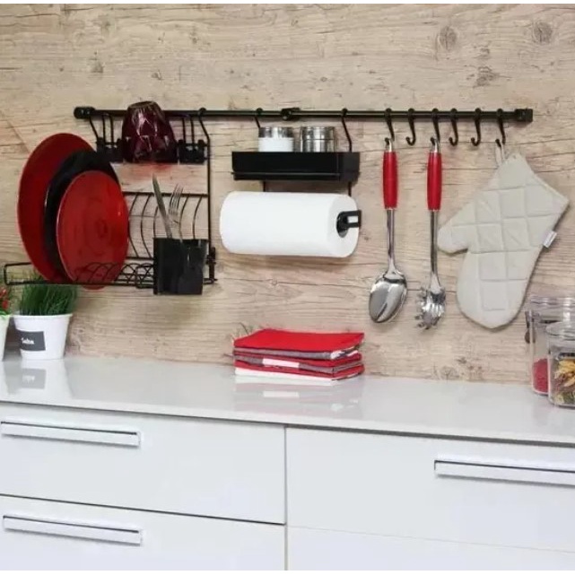 Kit Cozinha Barra Suspensa Escorredor Porta Tempero Rolos