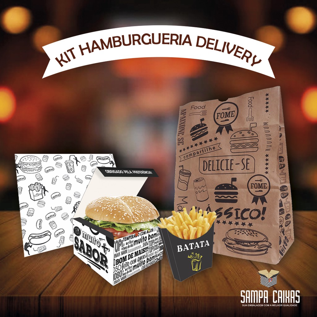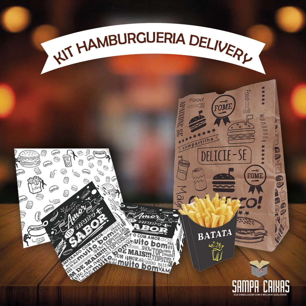 KIT Embalagem 100 hamburguer Delivery + 100 sacos delivey + 100 batata frita m + 500 papel acoplados