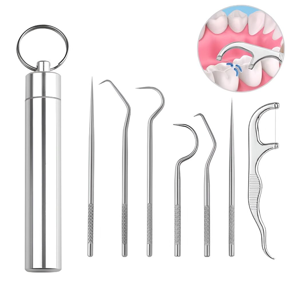 Kit com 7 Palitos De Dentes De Aço Inoxidável Reutilizáveis Portáteis Limpeza Oral