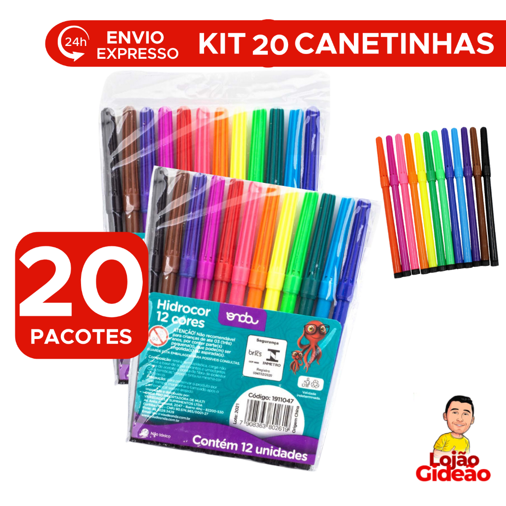 Kit Até 20 Pacotes De Canetinhas Com 12 Cores Hidrográfica Não Mancha Para Lembrancinhas e Revenda