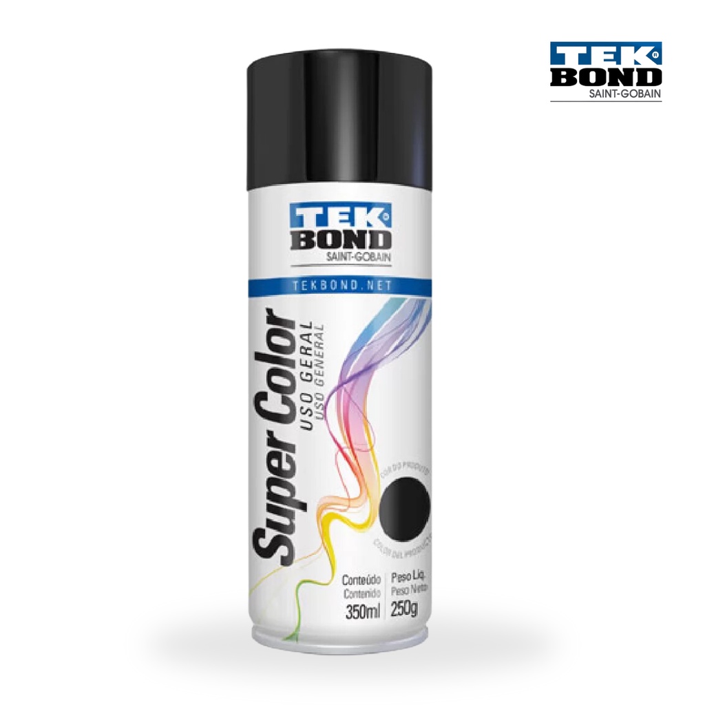 Tinta Spray Preto Brilhante SuperColor Verniz Uso Geral 350ml Tekbond Aerossol Secagem Rápida Gesso Cerâmica Aerosol