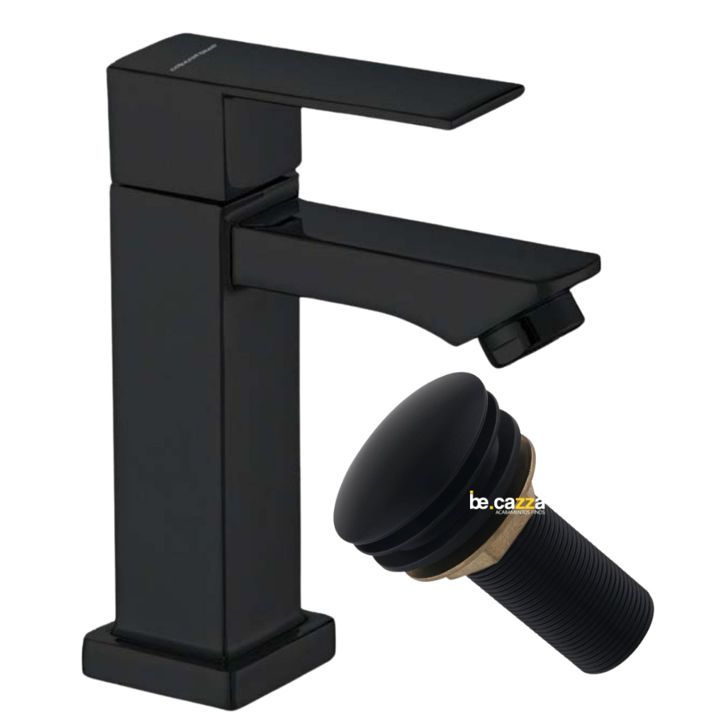 Torneira de Banheiro Quadrada Cuba Preto Fosco Metal Inox 1/4V+Valvula Click Metal 7/8 Preto Fosco