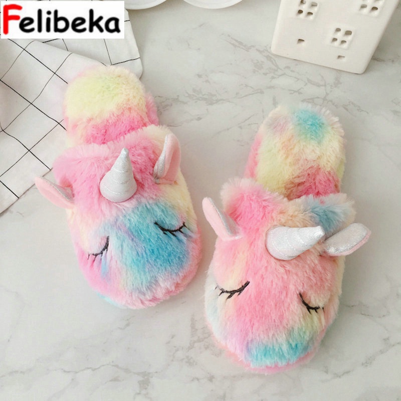 Pantufa/chinelo de pelúcia em forma de unicórnio arco-íris impermeável para mulheres/uso interno