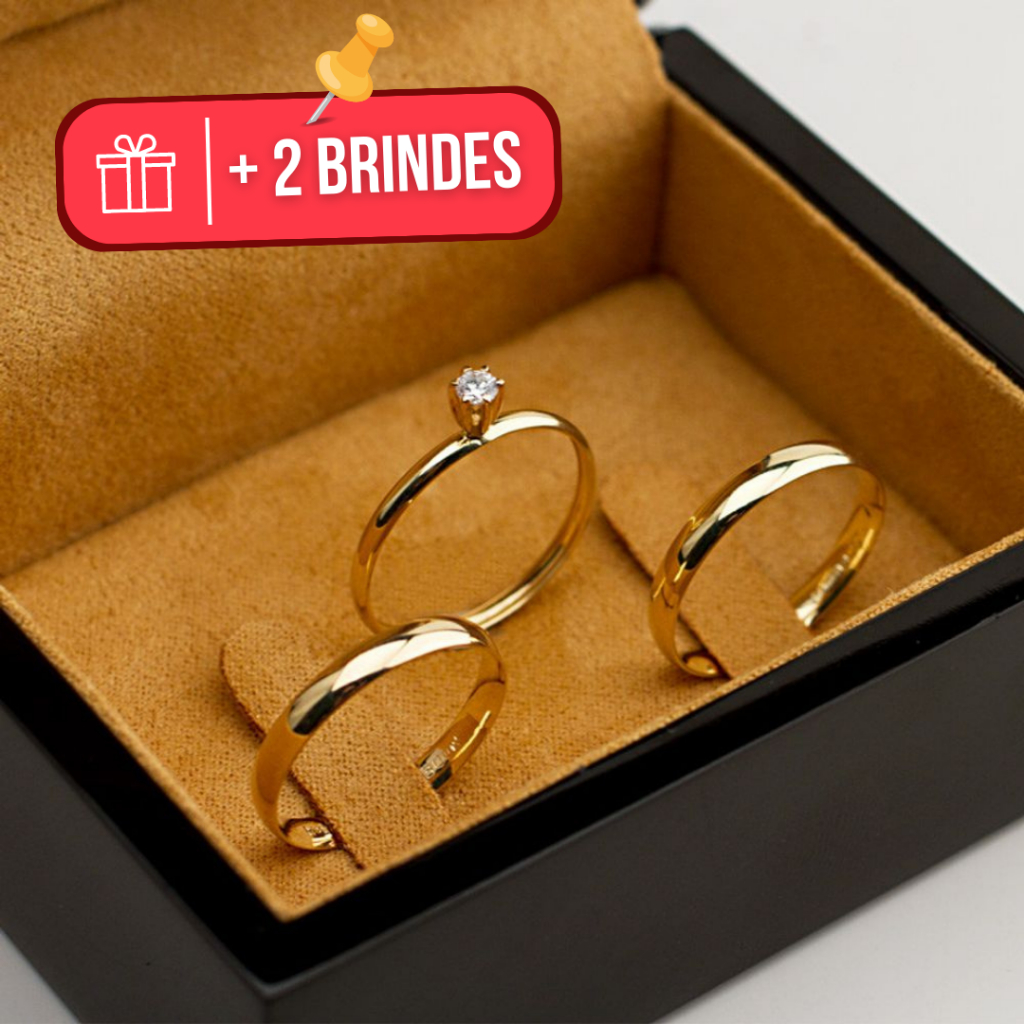 PROMOÇÃO Par de Aliança Casamento + Anel Solitário | Aliança 2mm Dourada Ouro Fina Lisa Delicada Casamento Noivado Compromisso