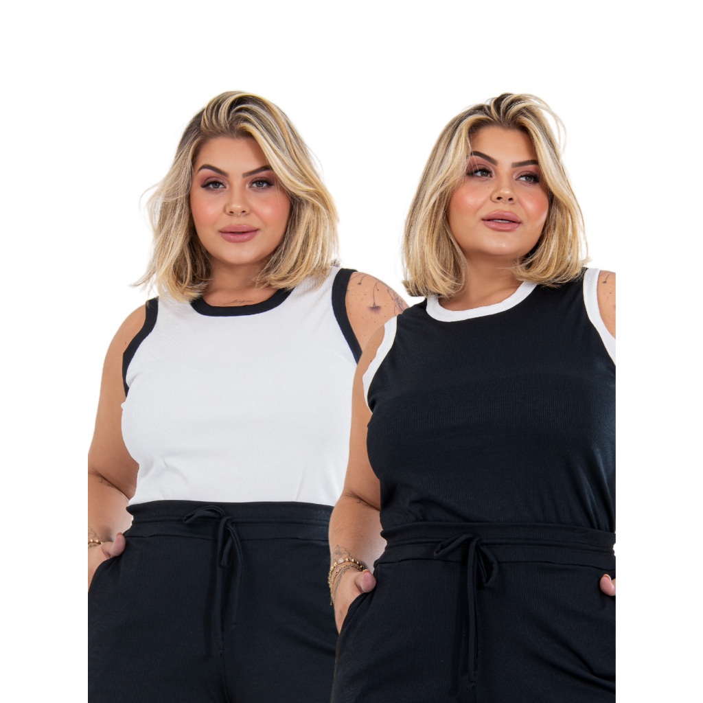 Kit 2 Regatas Blusa Plus Size Feminina Bicolor Canelado Alta Elasticidade Zero Transparência Verão Veste Até G4 Moda