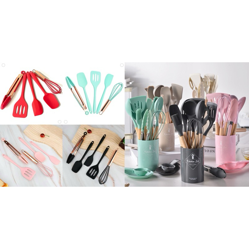 Jogo de Cozinha Kit Com 12 Peças de Silicone Utensílios e Copo Suporte para Cozinha Cabo de Madeira.