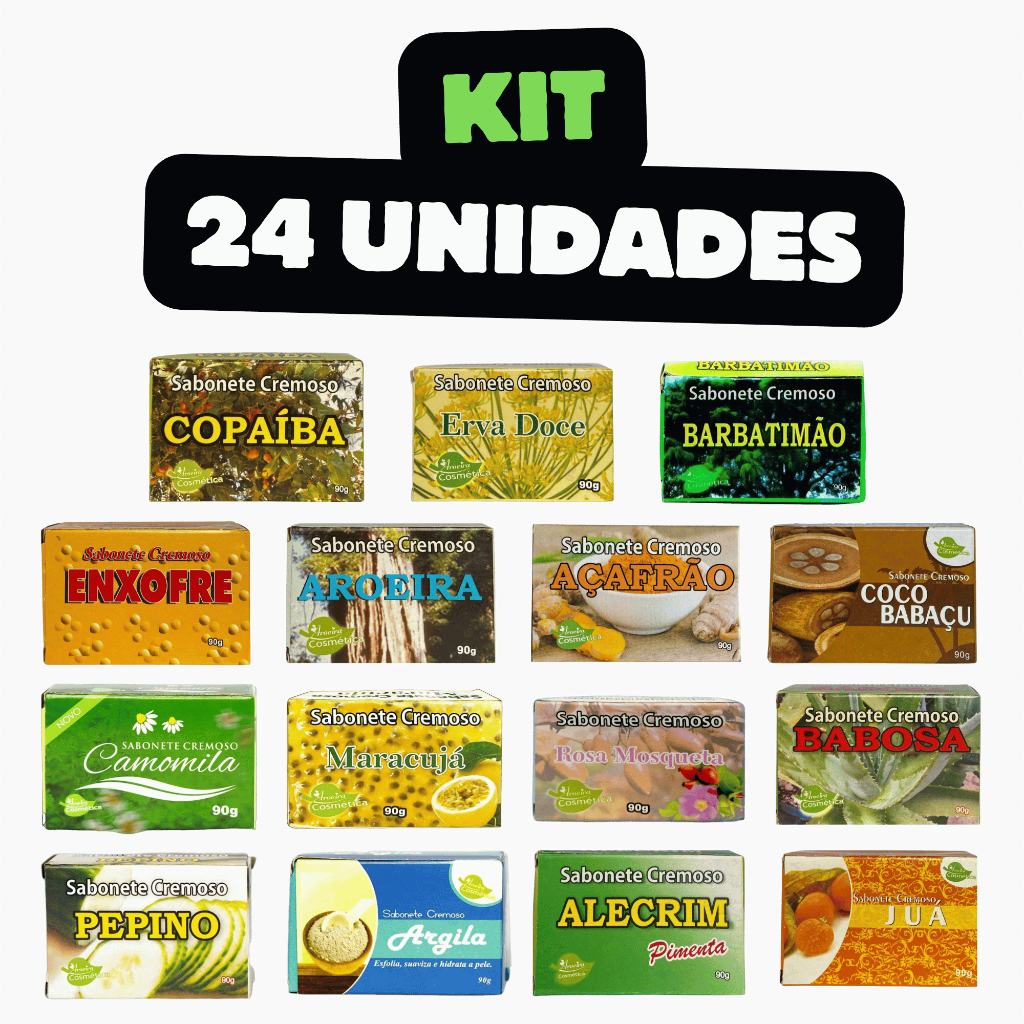 Kit com 24 - Sabonete Natural Cremoso - Açafrão - Aroeira - Pepino - Juá - Babosa - Copaíba - Argila - Camomila - Maracujá - Alecrim - Rosa Mosqueta - Coco Babaçu - Erva Doce - Enxofre - Barbatimão - 90g - Aroeira Cosmética