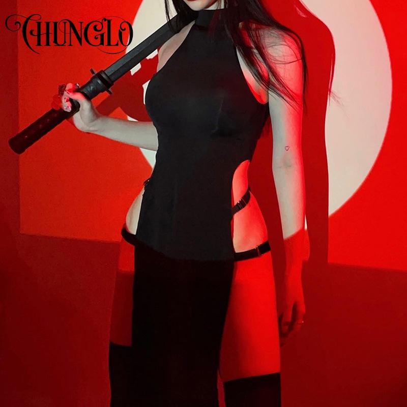 CHUNGLO Cosplay Lado Alto Dividido Sexy Vestidos Sem Manga Para Mulher Gótico Cintura Alta Y2k Slim Vestido Feminino De Halloween Harajuku Summer Night Clubwear