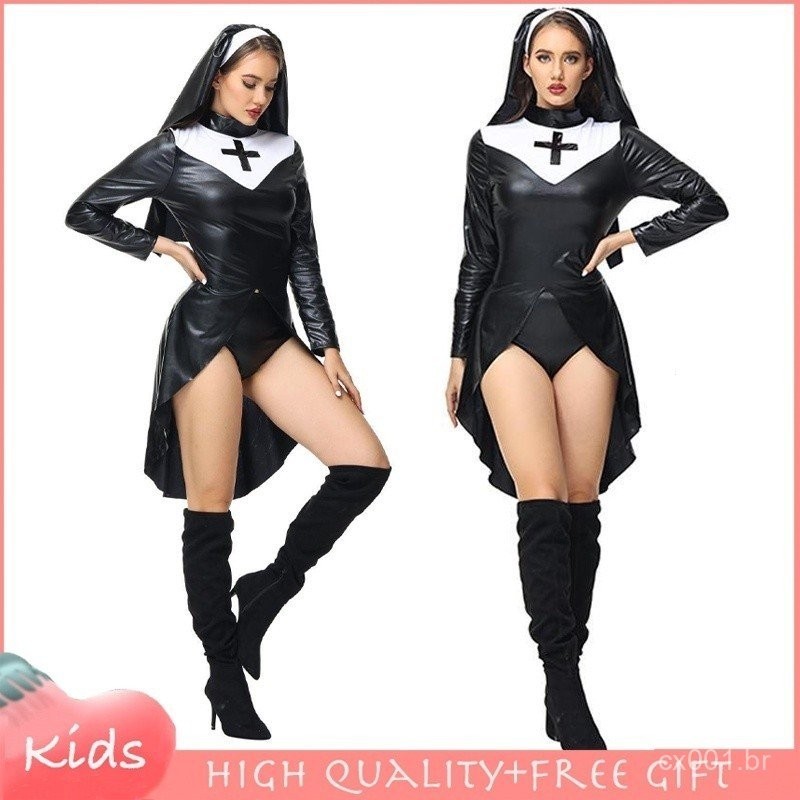 Sexy Fantasia De Freira Preta Cosplay Para Mulher Vestido De Manga Longa Apertada Fantasias De Festa De Halloween Adultos