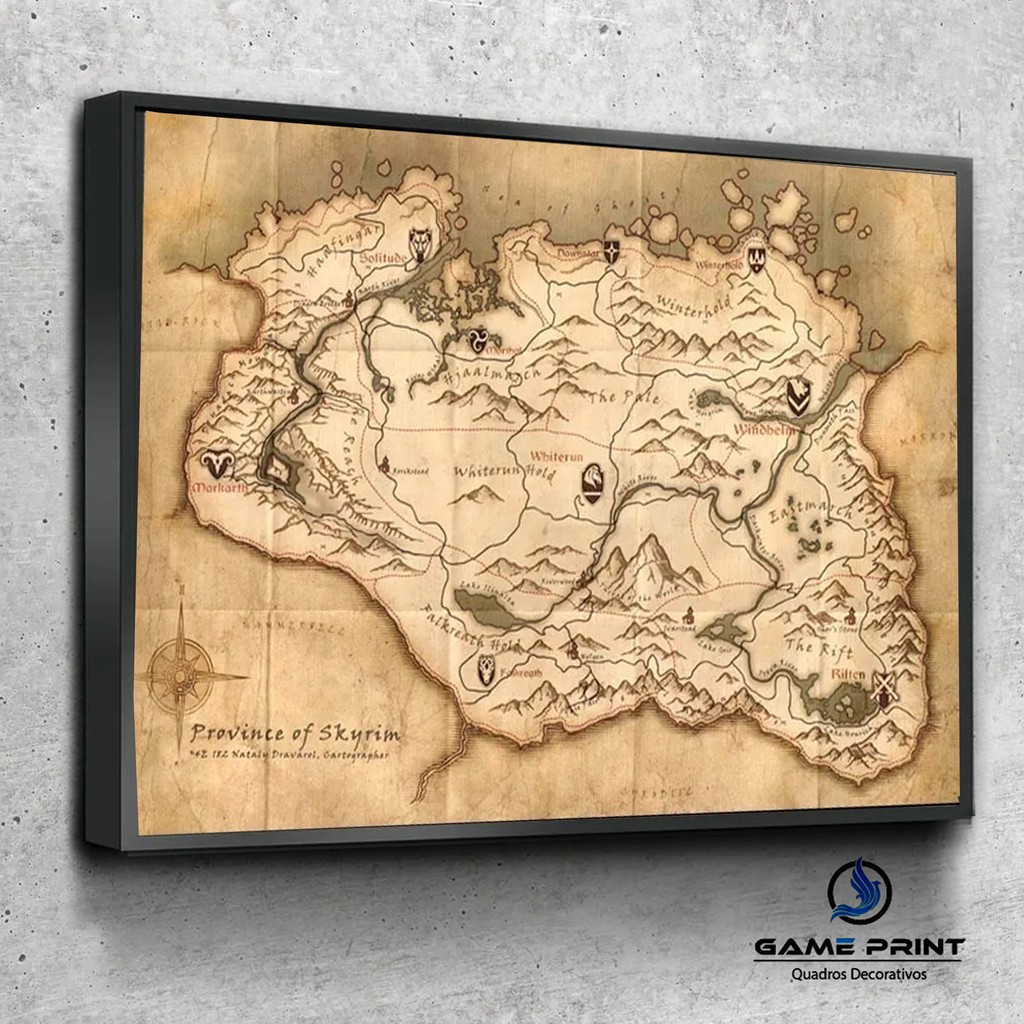 Quadro Decorativo game geek Mapa Elder Scrolls Skyrim com Moldura