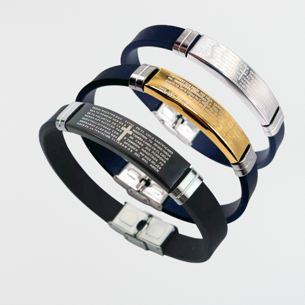 Kit 3 Pulseira Masculino Feminina Bracelete SILICONE COM PLACA Folheado Pai Nosso Proteção em Promoção