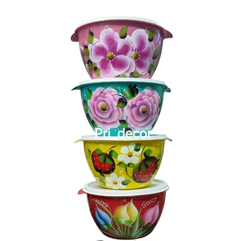 Kit 4 peças saladeira 3 litros decorado a mão,saladeira colorida com tampa branca,saladeira plástico salada churrasco
