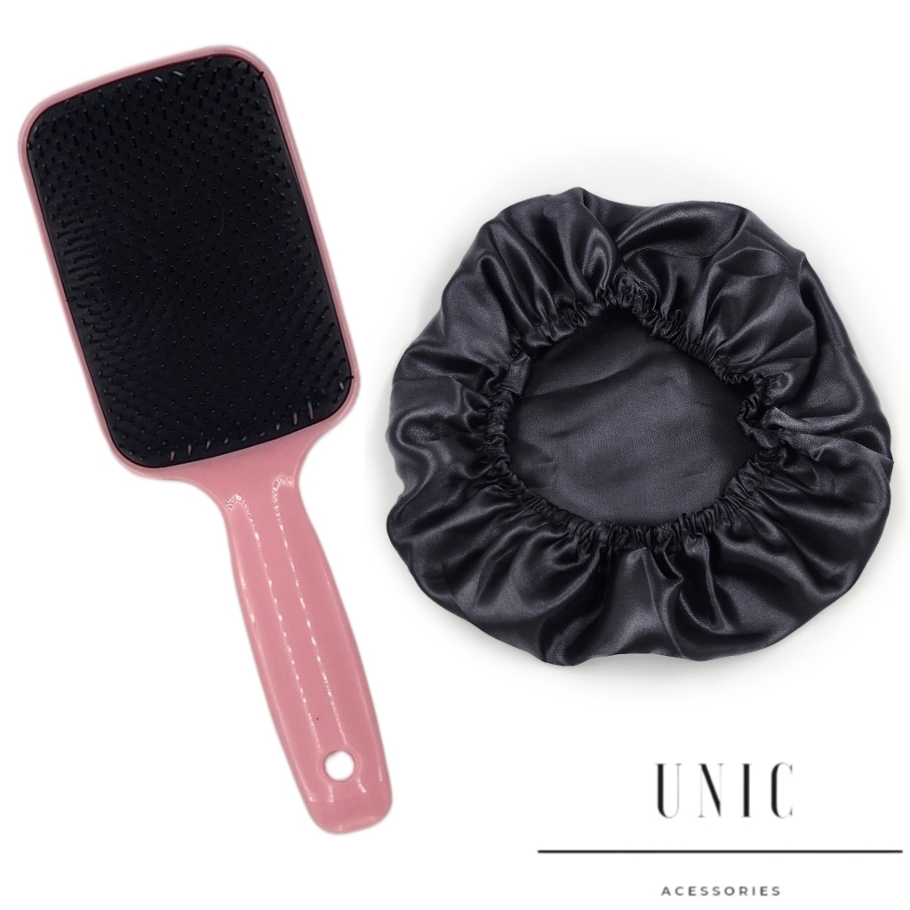 Kit 1 Escova Raquete + 2 Touca Dupla Cetim anti-frizz Promoção