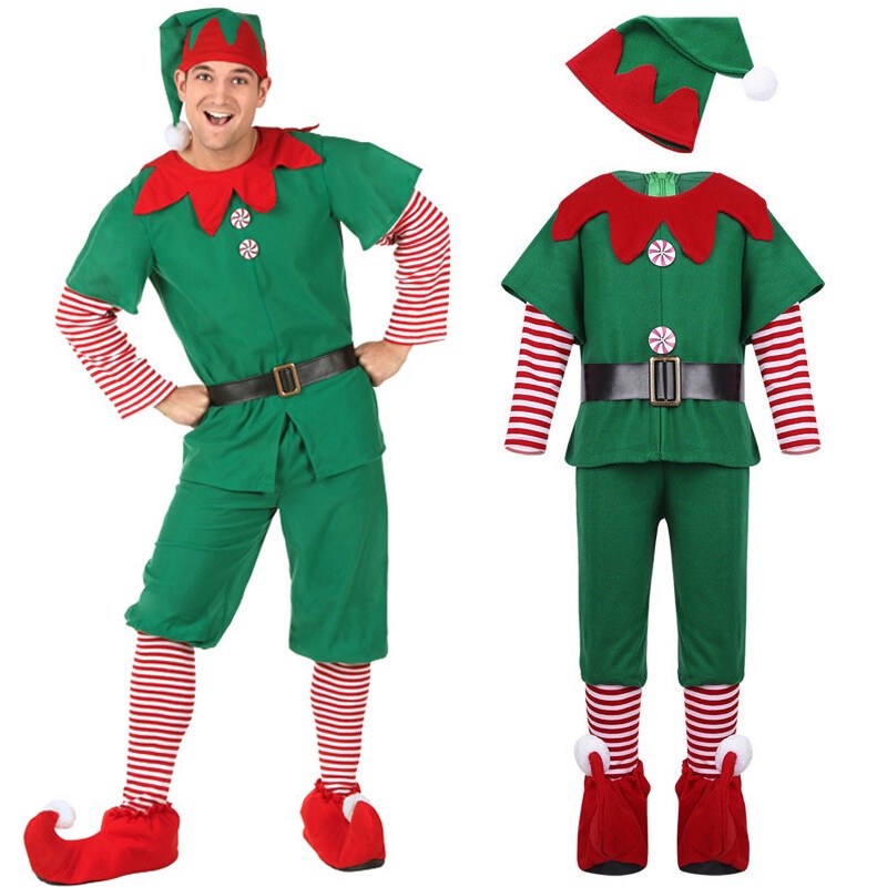 5 Pçs Ternos Adultos Traje De Elfo De Natal Para Papai Noel Uniforme Conjunto Vestido De Festa Com Sapatos Chapéu