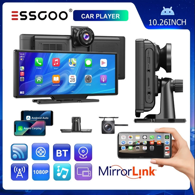 ESSGOO 10.26 polegadas carro gravador de condução sem fio Apple Carplay & Android-auto & Mirror link rádio do carro multimídia dois câmera player