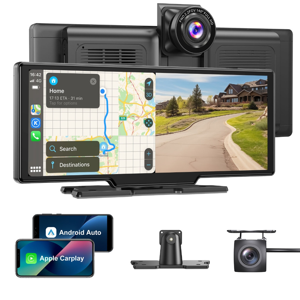 ESSGOO 10,26 polegadas Gravador de direção sem fio Apple Carplay e Android-auto Câmera dupla Multimídia Player