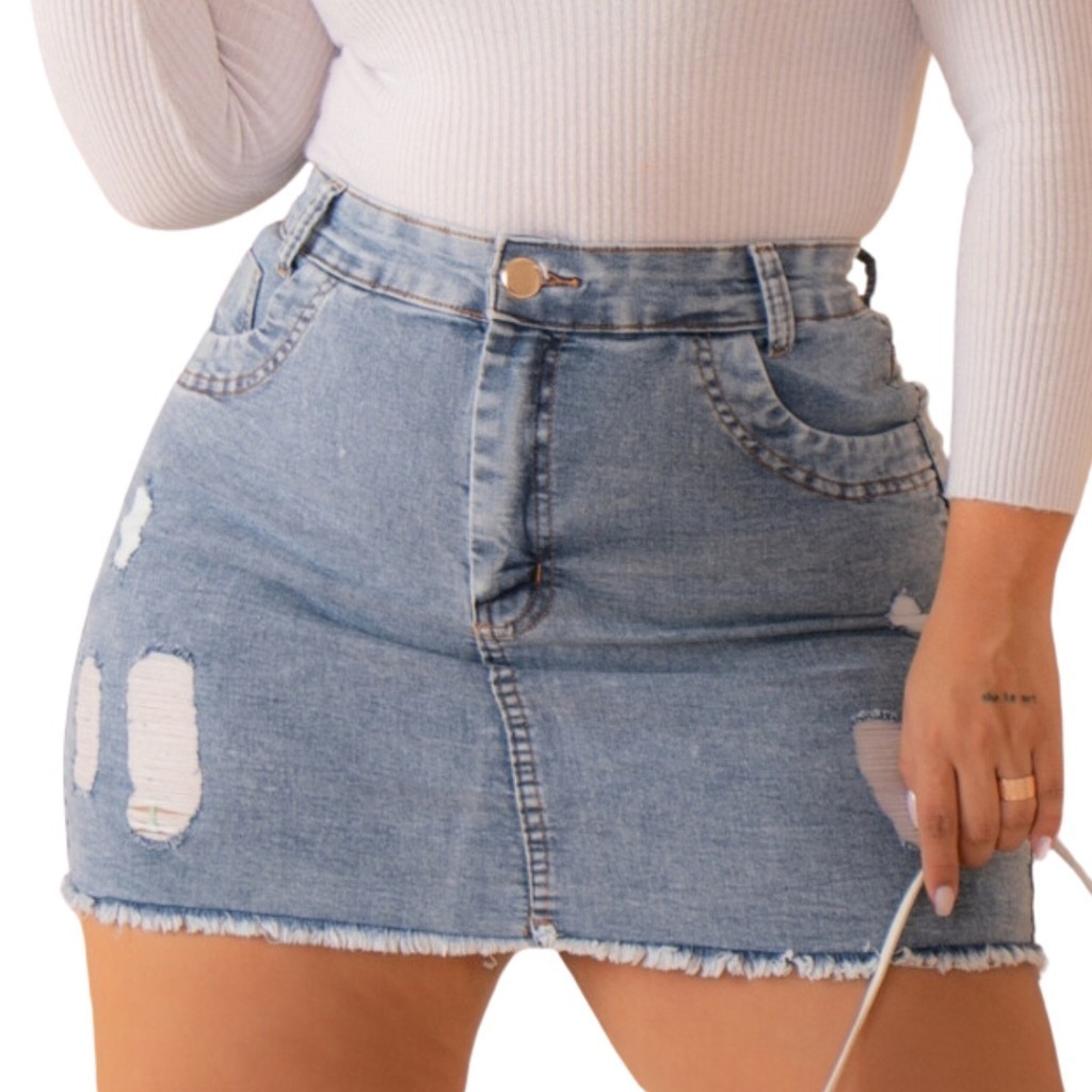 Saia Jeans Plus Size Feminina Cintura Alta Com Lycra Desfiada Destroyed Levanta Bumbum