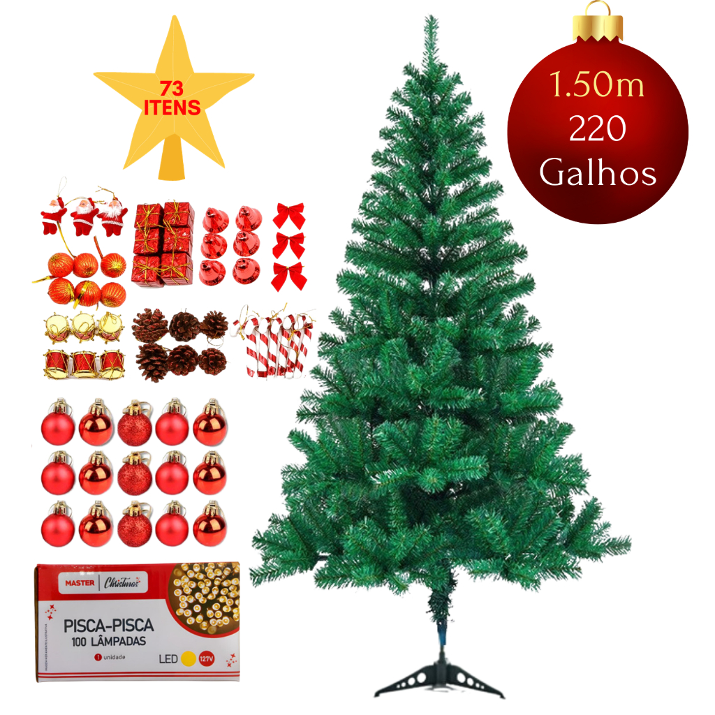 Árvore Natal Pinheiro Premium 150cm 1,50m 220 GALHOS Enfeitada Decorada Luxo Kit 73 Enfeites Completa Enfeites Papai Noel Natalino