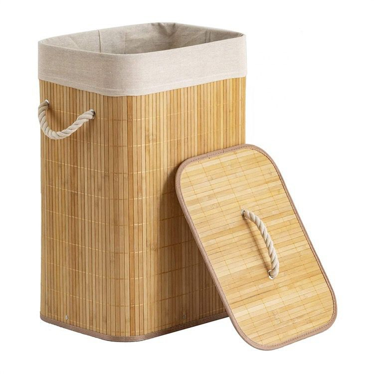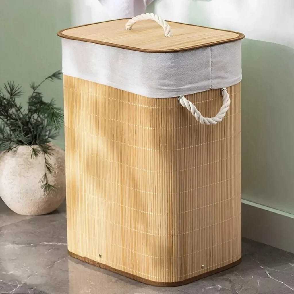 Cesto De Roupa Suja Bambu Dobravel Organizador Forrado Banheiro 60cm Cesto Retangular com Alça Cesto Organizador Brinquedo Quarto Banheiro