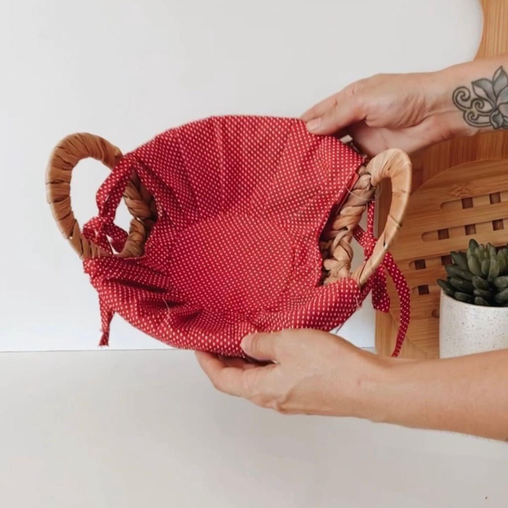 Cesto Fibra Natural Alça De Metal Revestida Fibra 27x8cm Com Forro Natalino Poa