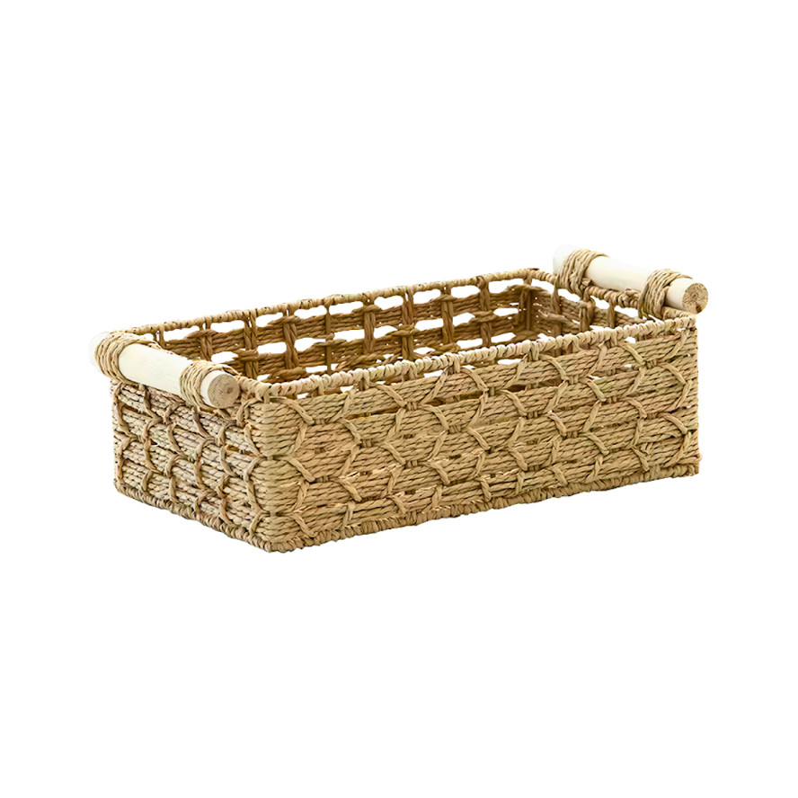 Cesto Decorativo Organizador Retangular Fibra Natural Seagrass Grande Alça De Madeira